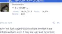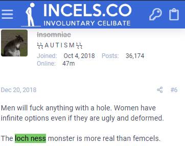 tbh [to be honest] most incels could probably have sex with some used up cumdumster but [the] effort you have to put [in] for it is simply not worth it, getting rejected, mocked thousands of times and ofc [of course] competing against dozens of other dicks while 1/10 queen just sits back and waits for the winner.