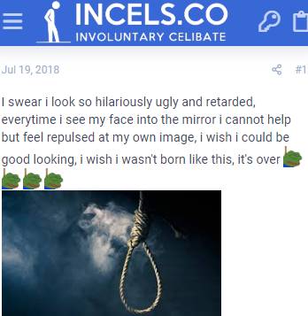 Die Aussichtslosigkeit wird häufig durch die Aussagen ‚„it’s over“ oder „it never even begun“ ausgedrückt. Teilweise werden diese durch ein „go rope“, den Aufruf zum Suizid ergänzt. Suizid als Ausweg aus dem Inceldom ist ein präsentes Thema im Forum. Chads und Stacys in einer Beziehung zu sehen wird beispielsweise als „rope material“ oder „suicide fuel“ bezeichnet.