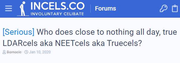 Diese Überzeugung manifestiert sich im NEET-Lifestyle, der von vielen Incels gepflegt wird. NEET steht für ‚No Education, Employment or Training‘. Dieser Lifestyle ist häufig mit dem Leitsatz ‚Lay Down And Rot‘ (LDAR) gekoppelt. LDAR bedeutet, dass man durch die Einsicht der Blackpill die Ausweglosigkeit der eigenen Situation akzeptiert und seine Tage in Isolation verbringt, da ein Leben als Incel durch die Unmöglichkeit eine (Sexual-)Partnerin zu finden keinerlei positive Facetten birgt.